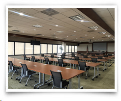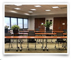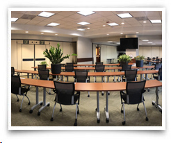 The Training Room has 2,000 square feet of space and is fully equipped with the latest in voice and data technology. There is an 8-foot multimedia screen with a liquid crystal display (LCD) projector, a full sound system, a recessed dry erase board and two 32-inch overhead flat screen monitors. A hard-wired PC in this room will accept flash drives or CDs for ease of presentation loading. Ideal for large-scale educational seminars, video viewings and meetings.